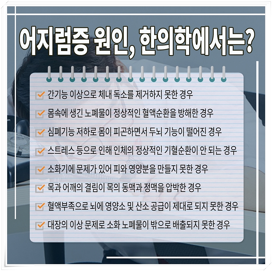 피로나 스트레스 등으로 인체 면역력이 무너지면 체내 장부 역시 제 역할을 하지 못하고 위축됩니다. 이 과정에서 생성된 발생한 노폐물이 혈관 내에 정체되면 원활한 혈행을 방해하게 되는데요. 이 과정에서 혈액을 통해 공급돼야 할 산소와 영양소가 뇌에 충분히 전해해지지 않게 되면서 어지럼증으로 이어지게 되는 것입니다. 또한 혈류 장애는 이압과 뇌압의 불안정을 불러와 증상을 더욱 악화시키는 요인으로 작용합니다.